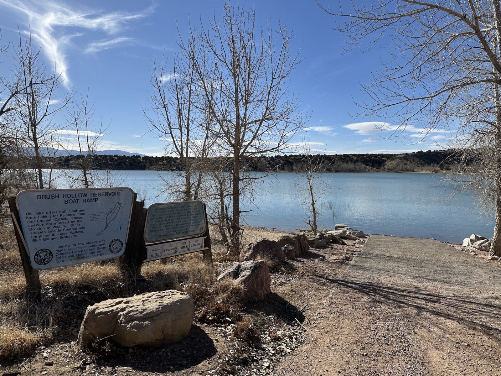 Boating: The Brush Hollow Reservoir boat ramp is located on the eastern shore of the lake. Boating is permitted with wake-less travel and the water is popular for fishing from kayaks and canoes.