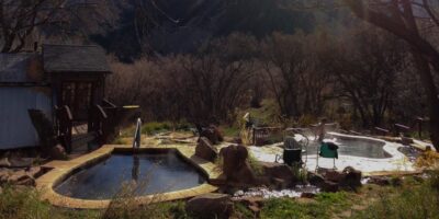 Hot Sulphur Springs Resort & Spa, based in Sulphur Springs, has 21 hot mineral pools fed from a stream coming right out of the ground. The pools have been developed, come in all shapes and sizes, and have water ranging from 95-112℉. Aside from the communal pools, there are also private baths that adults can rent. Accommodations include a cabin, basic rooms, and an apartment.