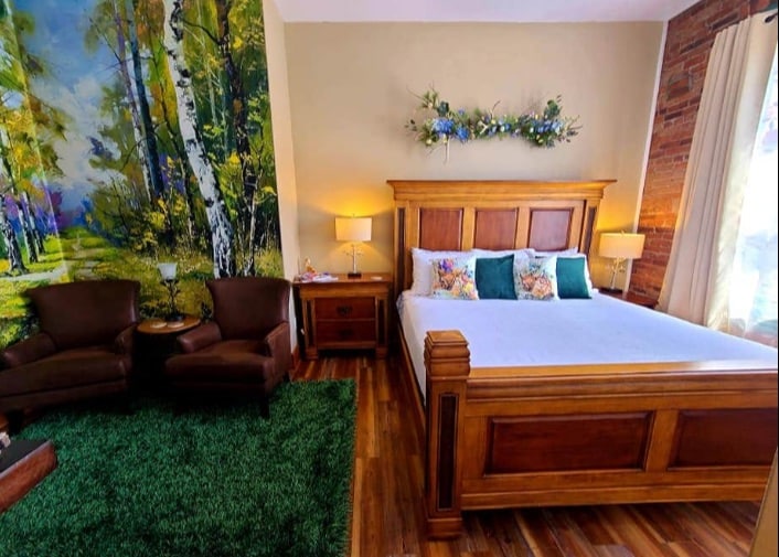 Summer Suite – single queen bed with a private bathroom and sitting area warmed by an electric fireplace. A sofa bed is offered as well, which can sleep 2.