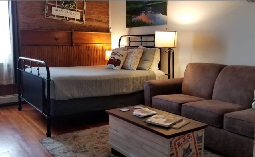 Summer Suite – single queen bed with a private bathroom and sitting area warmed by an electric fireplace. A sofa bed is offered as well, which can sleep 2.